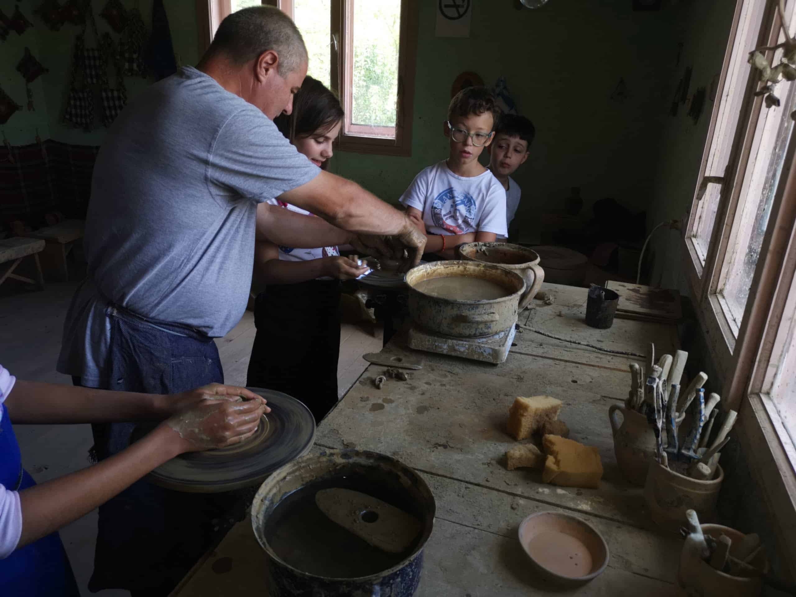 Una din zilele vacanței am dedicat-o artei meșteșugărești. Sună lucrativ, dar vă asigur că e distractiv nevoie mare. În zonă există câteva ateliere de olărit celebre, iar copiii și-au arătat deschiderea de a se mozoli câteva ore cu noroi.. Doar căam constatat de cu seara cam ce înseamnă “promovarea” mioritică. Deși gazda noastră ne-a indicat exact comuna unde se găsesc aceste ateliere, iar Internetul confirma parțial spusele omului, veți fi surprinși să constatați că nu există niciun fel de promovare exactă. Doar spusele unora, pe niște forumuri de turism și câteva referințe în ghidurile locale. Nu tu număr de telefon, adresă, iar de orar nici că încăpea vorba.