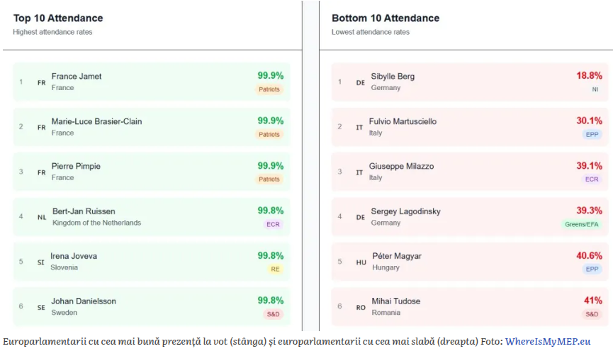 Platforma arată date pentru 16 dintre cei 33 de europarlamentari trimiși de România în Parlamentul European. Potrivit acestor date, Iuliu Winkler (UDMR) a votat de 1.160 de ori din totalul de 1.215 (95,5%). El este urmat în clasament de Georgiana Teodorescu (AUR) și Victor Negrescu (PSD), cu 91,9%.