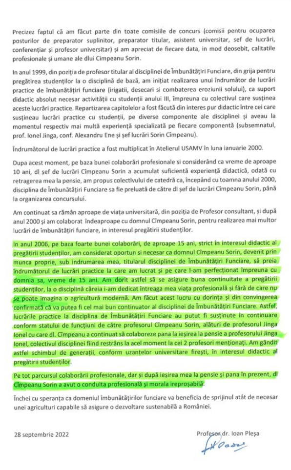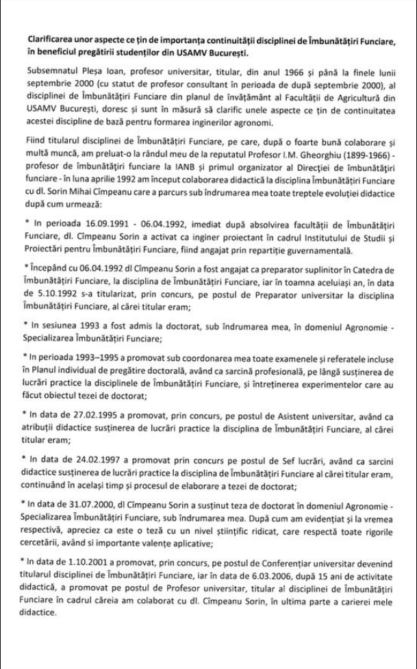 În documentul publicat de Cîmpeanu, profesorul Pleşa precizează că era titularul disciplinei Îmbunătăţiri Funciare de la Universitatea de Ştiinţe Agricole şi Medicină Veterinară din Bucureşti (USAMV-B), iar din aprilie 1992 a început colaborarea cu Sorin Cîmpeanu, care ”a parcurs toate etapele evoluţiei didactice”.