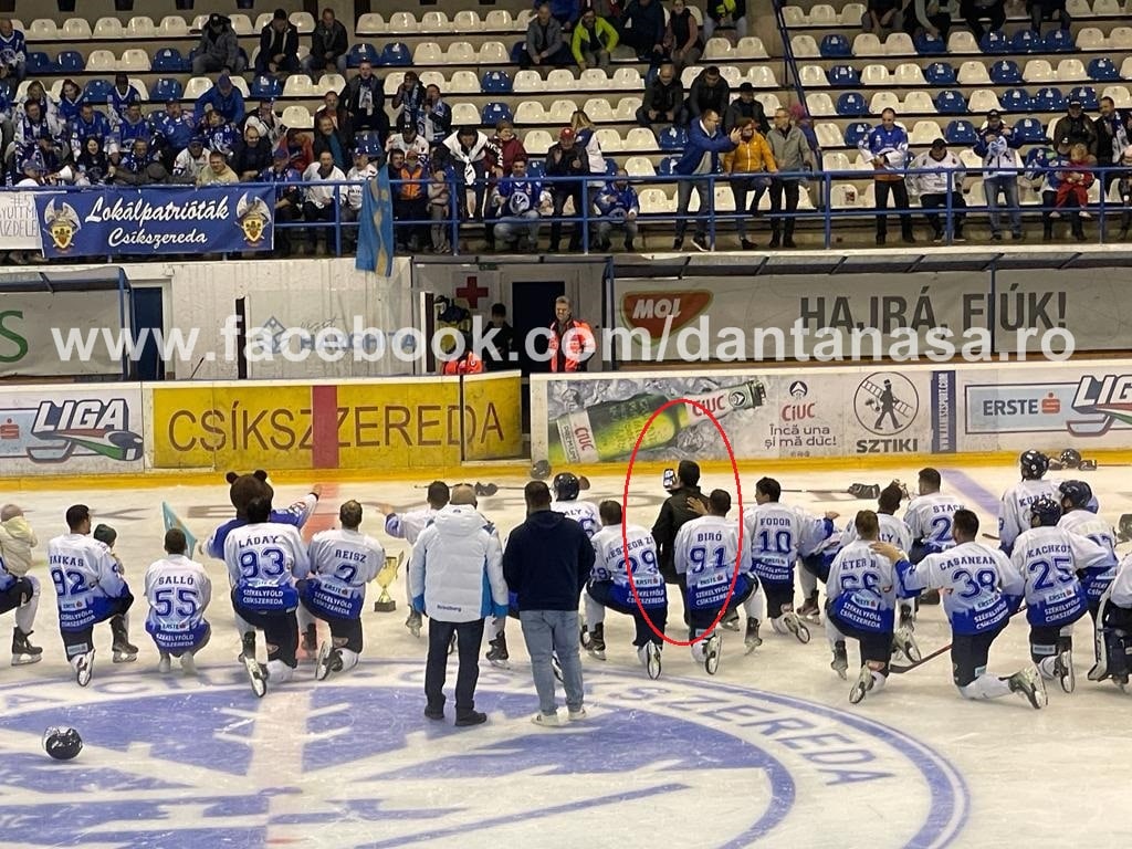 Tanczos Barna a coborât la finalul partidei în spațiul de joc și s-a alăturat hocheiștilor aflați în genunchi atunci când din tribune s-a auzit controversatul imn al Ținutului Secuiesc.