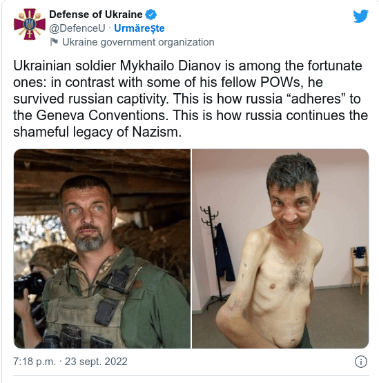 Ministerul ucrainean al Apărării a publicat vineri seara o fotografie în care soldatul apare extrem de slab și cu brațul rănit atrofiat. Și-a păstrat însă zîmbetul.