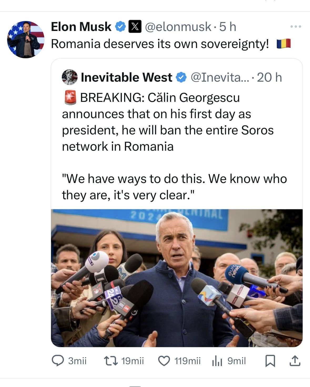 BREAKING: Călin Georgescu anunță că, în prima zi ca președinte, va interzice întreaga rețea Soros în România.”, a scris Elon Musk.