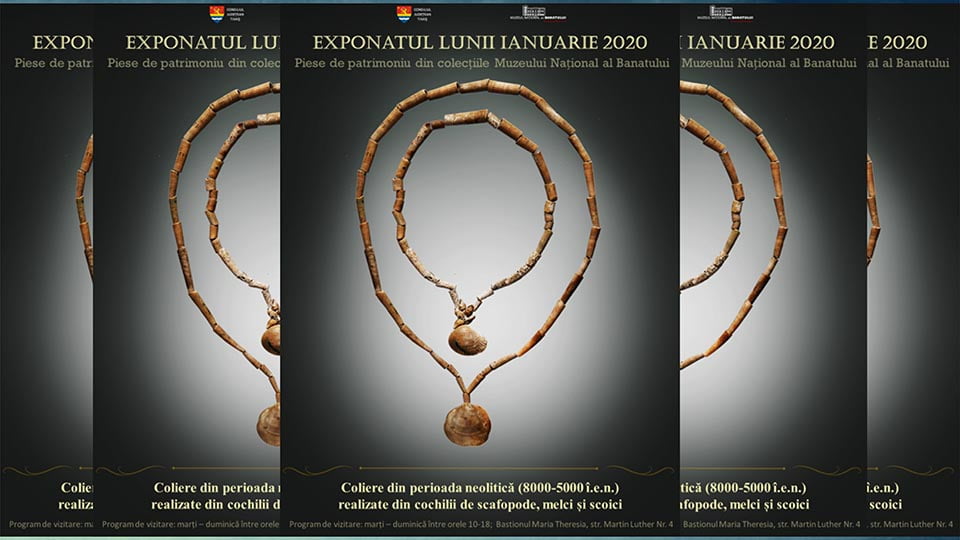 Două coliere din perioada neolitică (8.000 – 5.000 î.Hr.), realizate din cochilii de scafopode, melci şi scoici, care fac parte din piesele de colecţie ale Muzeului Naţional al Banatului (MNB), reprezintă exponatul lunii ianuarie şi pot fi vizionate pe parcursul întregii luni, pe simezele Bastionului Therezia din Timişoara.