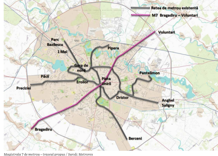 Rețeaua de metrou din București se extinde. În prezent există cinci magistrale de metrou, iar cea de a 6-a e în construcție spre aeroportul Otopeni. Miercuri, Ministerul Transporturilor anunță că demarează proiectul unei noi magistrale în Capitală – „Magistrala 7 de metrou – Bragadiru – Voluntari”, care va traversa orașul de la sud-vest la nord-est.