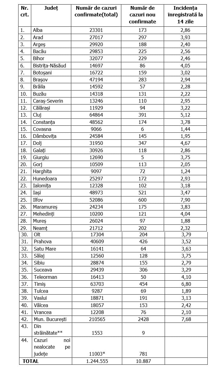 În total, în România au fost confirmate, până astăzi, 1.244.555 de cazuri de infectare cu COVID, dintre care 1.768 sunt ale unor pacienți reinfectați, testați pozitiv la o perioadă mai mare de 180 de zile după prima infectare.