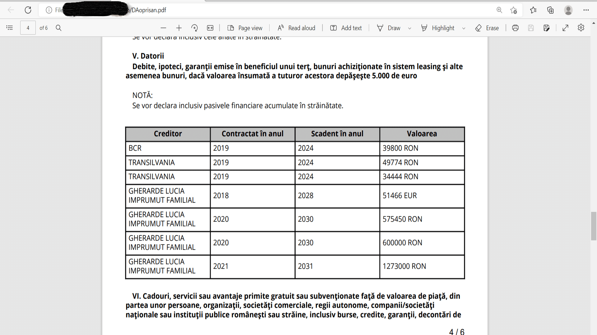 Potrivit propriei declarații, PSD-istul a luat anul trecut un credit nou, în valoare de 1,27 milioane de lei de la mama sa și pe care ar trebui să îl restituie în 10 ani. Ar rezulta (fără dobândă) că va trebui să dea înapoi suma de 106.300 lei pe an, în condițiile în care câștigă 148.000 de lei de la Consiliul Județean.