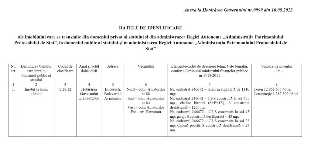 „Art.1. (1) Se aprobă trecerea unui imobil, aflat în datele de identificare prevăzute în anexa care face parte din prezenta hotărâre, din domeniul privat al statului și administrarea Regiei Autonome „Administrația Patrimoniului Protocolului de Stat”, în domeniul public al statului şi administrarea Regiei Autonome „Administrația Patrimoniului Protocolului Stat” şi declararea acestuia ca fiind afectat uzului şi interesului public general prin destinație”, se arată la primul articol din cele 3 pagini ale actului desecretizat.