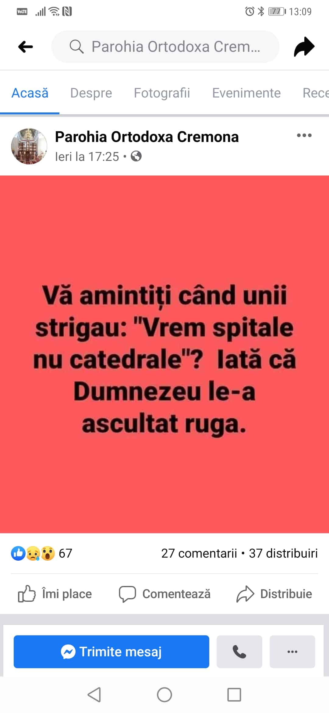 Un mesaj halucinant al unei instituții din subordinea Bisericii Ortodoxe Române face furori pe Internet! În vreme ce mai-marii Bisericii încearcă, cel puțin aparent, să empatizeze cu românii disperați și îngrijorați de coronavirus, Parohia Ortodoxă Cremona pare că ne ia la mișto. Mesajul postat pe pagina oficială de Facebook a acestei structuri i-a lăsat interziși nu doar pe românii din acel orășel din Italia, ci pe majoritatea celor care urmăresc spațiul virtual bisericesc. În câteva ore, postarea cu pricina s-a umplut de comentariile celor îngroziți și oripilați deopotrivă de mesajul ironic și trufaș al unei biserici. Textul postat sub forma unei fotografii este următorul: – Vă amintiți când unii strigau “Vrem spitale, nu catedrale?!” Iată că Dumnezeu le-a ascultat ruga..