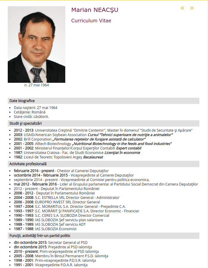 Neacșu e expert contabil și are mai multe specializări în nutriția animalelor, potrivit CV-ului oficial.