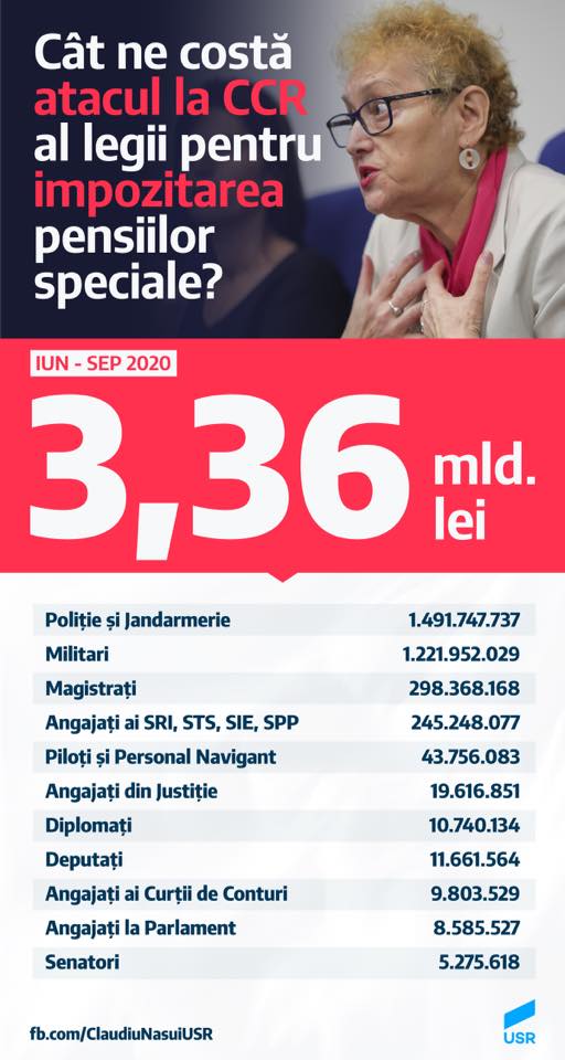 Mai precis, 3,36 miliarde lei au fost cheltuiţi în perioada iunie-septembrie 2020, pe pensii speciale.