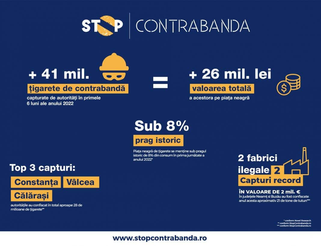 În primele șase luni ale anului 2022, autoritățile romane au capturat peste 41 de milioane de țigarete, a căror valoare de piață se ridica la peste 26 de milioane de lei (peste 5 milioane de euro), conform datelor stopcontrabanda.ro, singurul centralizator în timp real al capturilor de țigarete de contrabanda din Romania.