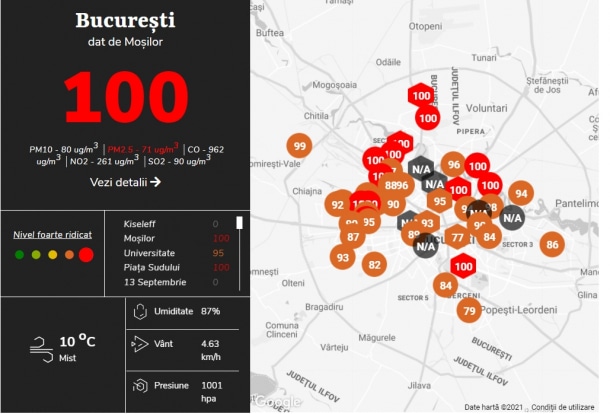 Nivelul poluării este foarte ridicat luni dimineață în București, cu majoritatea senzorilor platformei airlive.ro la 100 în toate zonele Capitalei. Șeful Gărzii de Mediu, Octavian Berceanu a recomandat bucureștenilor să nu aerisească apartamentele în această dimineață, spunând că o pot face către prânz.