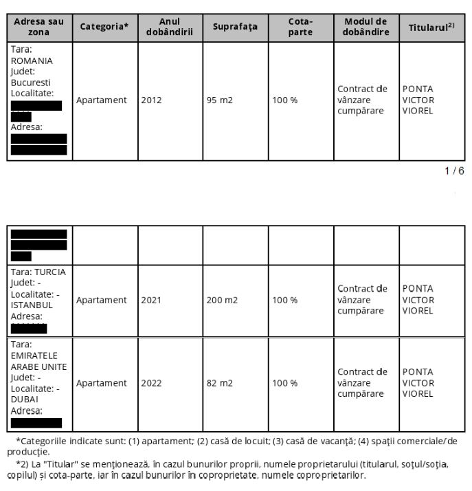 În documentul oficial, fostul premier a menționat că deține trei apartamente, inclusiv unul în București, achiziționat în 2012, și două apartamente în străinătate: unul în Turcia, cu o suprafață de 200 de metri pătrați, și altul în Emiratele Arabe Unite, cu 82 de metri pătrați. Aceste achiziții au avut loc între 2021 și 2022.