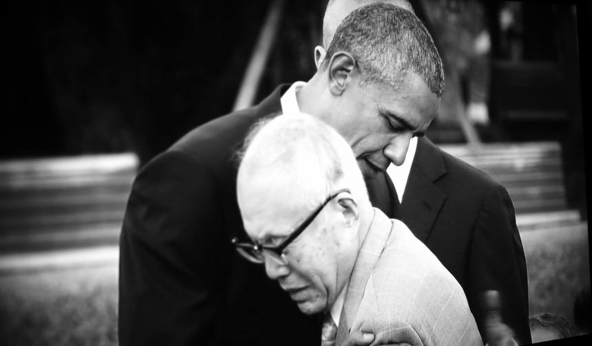 Shigeaki Mori, care avea opt ani când bomba a doborât Hiroshima, a fost îmbrăţişat de Barack Obama în timpul vizitei sale din 2016 la memorialul bombei atomice, un moment care a devenit o imagine emblematică a acelei vizite.