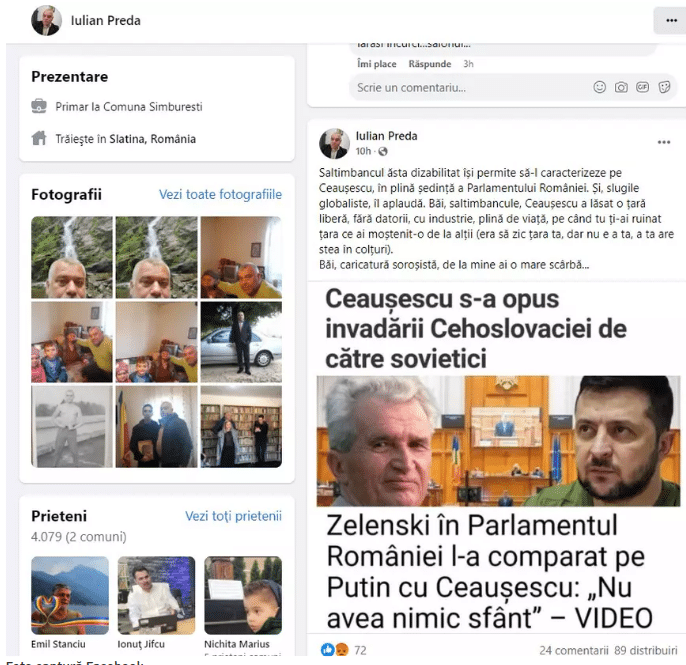 Primarul PSD al unei localități din Olt, Iulian Preda, ales de peste 91% din alegătorii de la scrutinul din 2020, îl numește pe președintele Ucrainei „circar” şi „bufon sorosist”, lăudând-i totodată pe Ceaușescu și Șoșoacă.