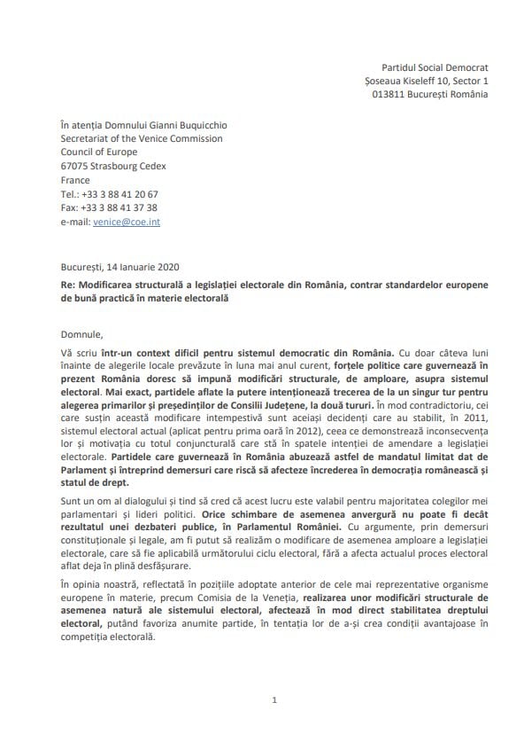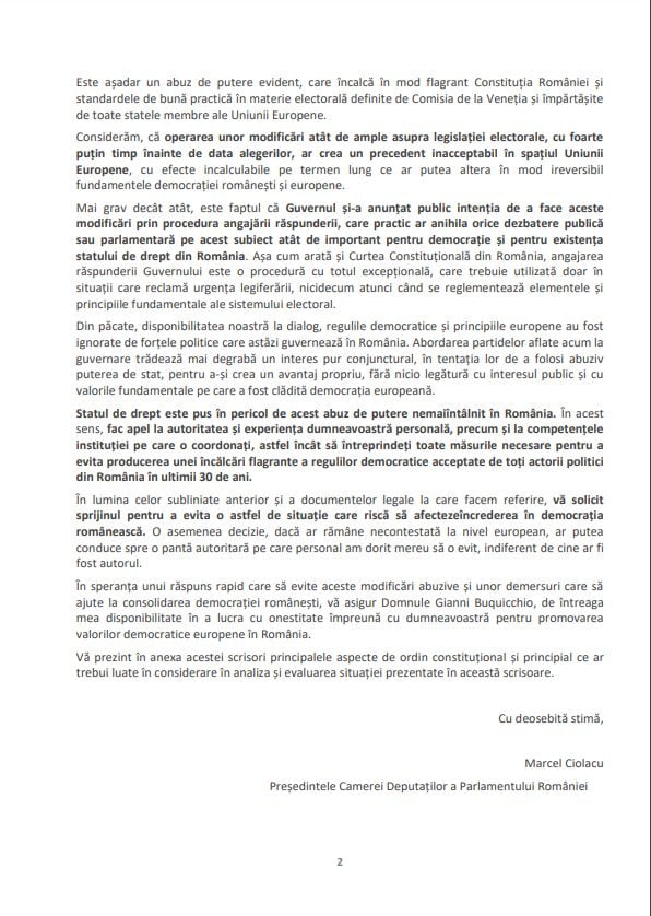 „Am mai luat o decizie, să trimitem o scrisoare din partea PSD atât președintei Comisiei Europene, cât și grupului social-democrat din Parlamentul European și la președintele Parlamentului European și la toți europarlamentarii. Acest abuz de a schimba legile electorale în pofida unei decizii a Curții Constituționale și a unei recomandări a Comisiei de la veneția. Nu ai dreptul, într-un stat european, sub nicio formă să modifici legile electorale cu două-trei luni înainte de momentul electoral. Nu s-a întâmplat niciodată în istoria României așa ceva și sperăm nici să nu se îmtâmple”, a declarat Marcel Ciolacu.