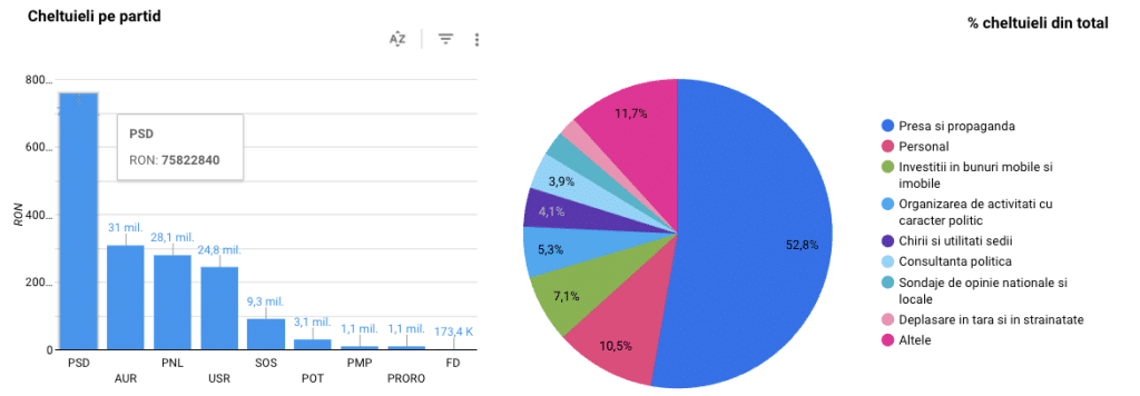 - AUR a cheltuit 31 milioane de lei: 53% pentru presă și propagandă (16 mil. lei), respectiv încă 1,8 mil. lei (5,9%) pentru producția si difuzarea de spoturi publicitare. În plus, 7,8% au mers la către linia bugetară organizarea de activități cu caracter politic (2,4 mil lei) și 6,5% pentru deplasări în țară si in străinătate (2 mil. lei). Pentru personal partidul a cheltuit 5%, adică 1,6 mil lei. AUR a plătit 1,2 mil. lei pentru investiții imobiliare. Restul de fonduri au fost cheltuite pe alte categorii.