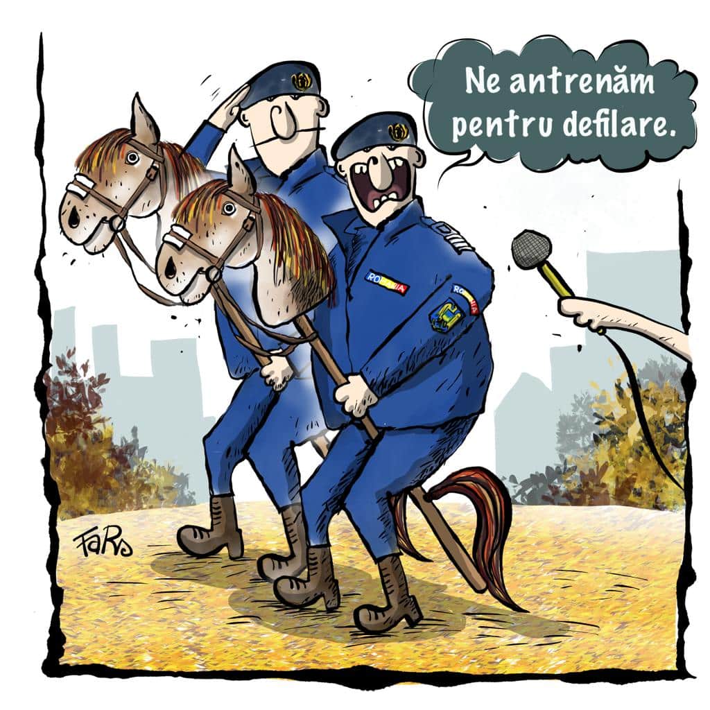 Parada de Ziua Națională a României a avut și momente hilare, atât în București, cât și în țară. Urcatul pe cal la Jandarmeria Română pare să fi fost o încercare grea. Din acest motiv, Radiografia lui Sergiu Fărcasanu a surprins exact acest moment..