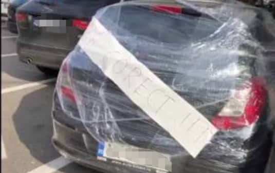 Mașina cu numere de Neamț a fost înfășurată în totalitate în plastic, iar peste folie au fost aplicate mesaje cu textul ”Parchează corect”, scrie monitorulsv.ro.