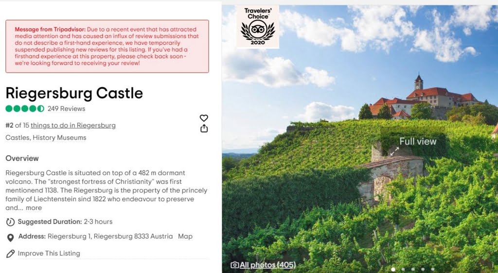 Ulterior, cunoscutul site pentru rezervări de vacanță, Tripadvisor, a blocat joi, 6 mai, recenziile la Castelul Riegersburg.