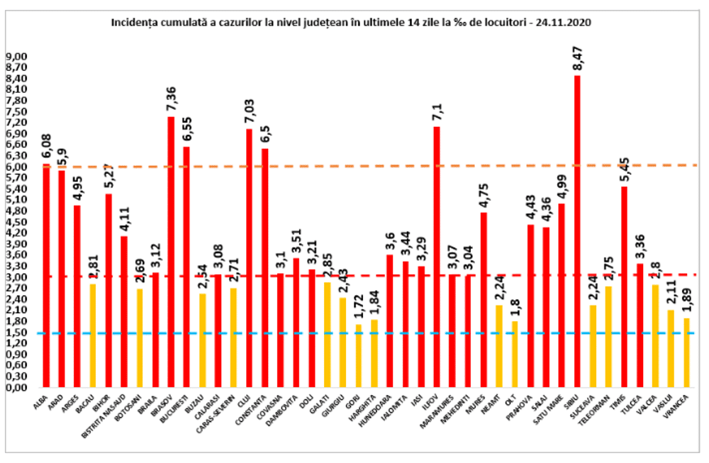 Cu o rata de infectare de 6,55 la mia de locuitori, Municipiul București are 1147 de cazuri noi și 60859 per total.