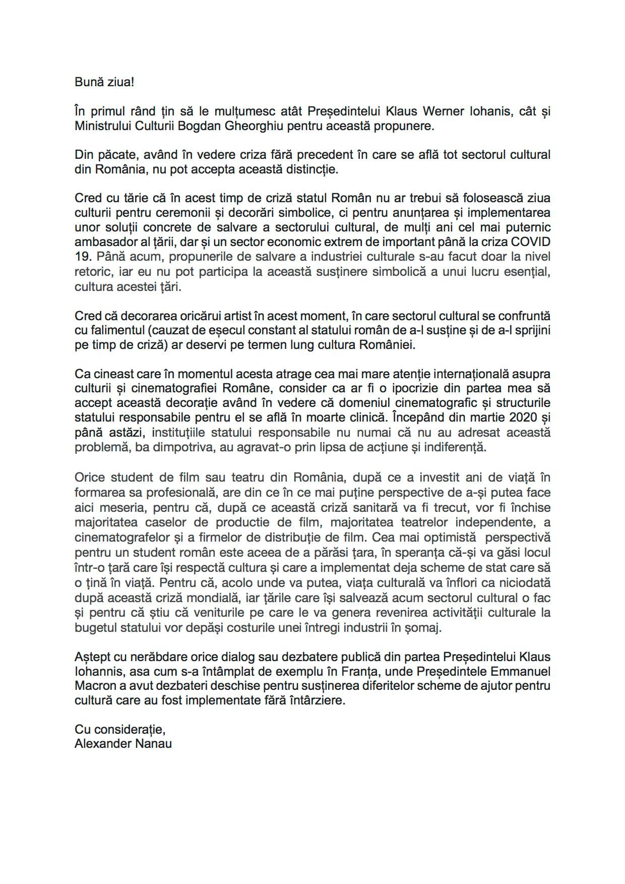 „Cred că este cel mai cinic moment pentru a decora, simbolic şi gol de sens, cultura României. După aproape un an de eforturi şi propuneri din partea tuturor sectoarelor culturale de a angaja statul român în implementarea de mecanisme de susţinere a culturii sever ameninţate de faliment în timpul crizei Covid-19, reacţia şi intervenţia concretă a statului român la toate nivelurile instituţionale a fost zero”, a scris regizorul pe Facebook.