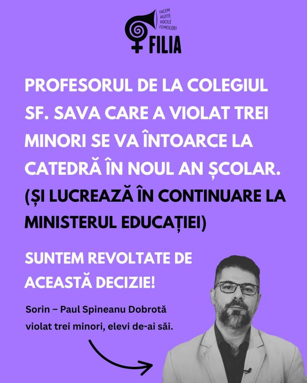 „Revoltător: profesorul de la Colegiul Național Sfântul Sava care a violat trei minori se întoarce la catedră. Și lucrează șI la Ministerul Educației – România în continuare.”, scrie Centrul FILIA, pe facebook.