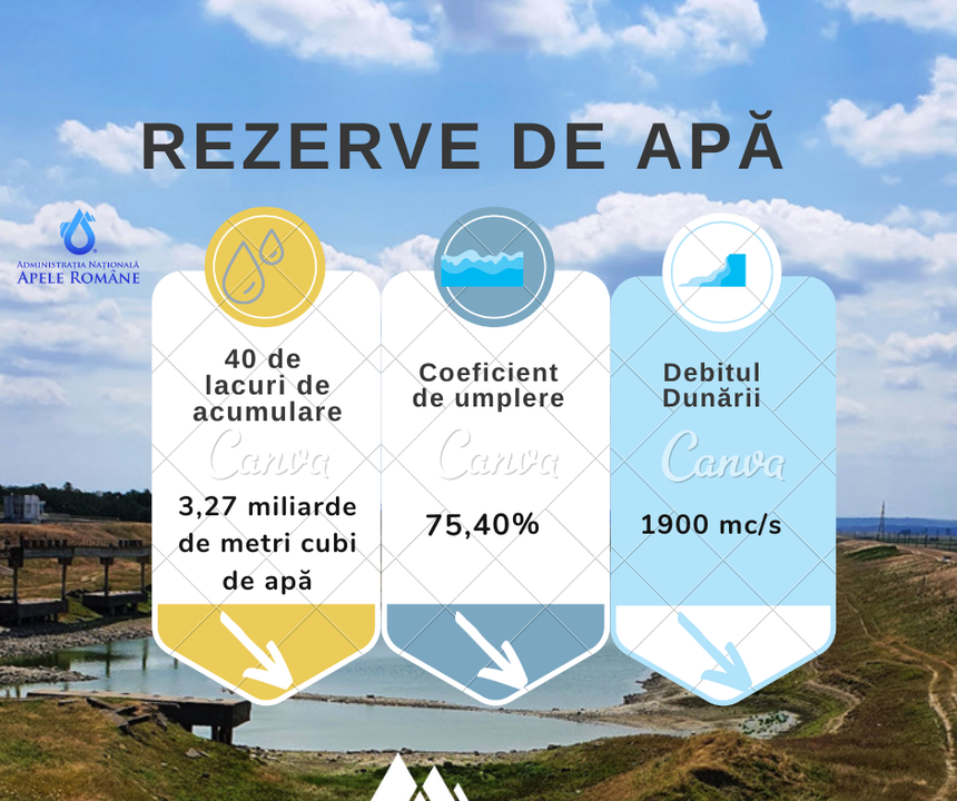 ”Chiar dacă rezerva (strategică) de apă din principalele 40 de lacuri de acumulare îşi menţine tendinţa de scădere până la sfârşitul lunii iulie, aceasta poate satisface necesarul de apă pentru toţi beneficiarii care se alimentează centralizat din sursa de suprafaţă. Administraţia Naţională „Apele Române” face în continuare apel la calm şi responsabilitate socială în direcţia folosirii raţionale a resurselor de apă şi pe cât posibil a economisirii acestora. Pentru activităţile casnice, vă recomandăm, acolo unde există posibilitatea, să apelaţi la folosirea/stocarea apei din surse alternative (inclusiv a celei de ploaie, când este posibil), astfel încât apa de băut (potabilă) să ajungă tuturor”, se arată în comunicatul oficial al Apelor Române.