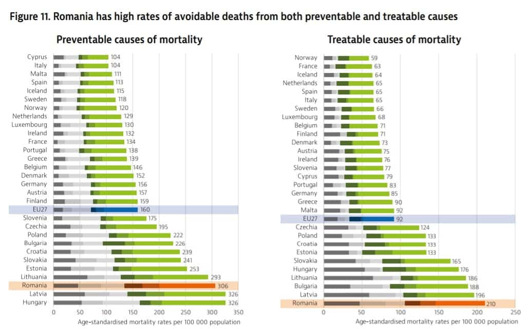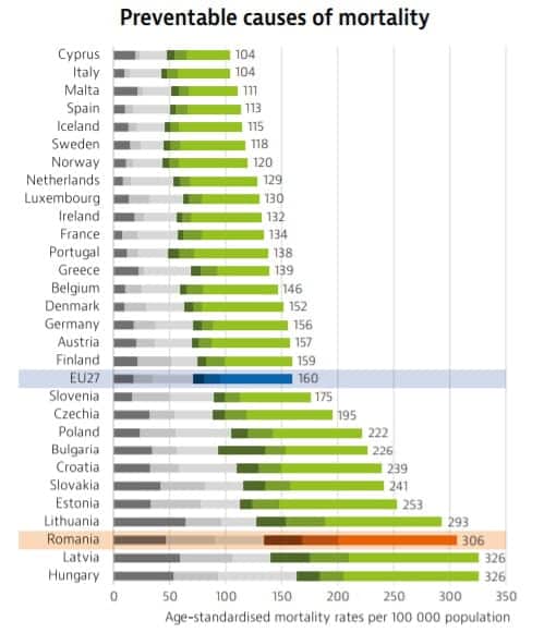 România ocupă, de asemenea, locul 3 în Uniunea Europeană la numărul de decese din cauze prevenibile (moartea ce poate fi evitată în principal prin intervenții de sănătate publică și de prevenție primară).
