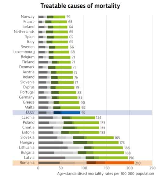 La fiecare 100.000 de români, 210 mor din cauze tratabile, ceea ce înseamnă o medie de unul din 476 de români, arată Hotnews. Media celor 27 de state membre ale Uniunii Europene este de 91 de decese tratabile la suta de mii de locuitori – mai puțin de jumătate față de România.