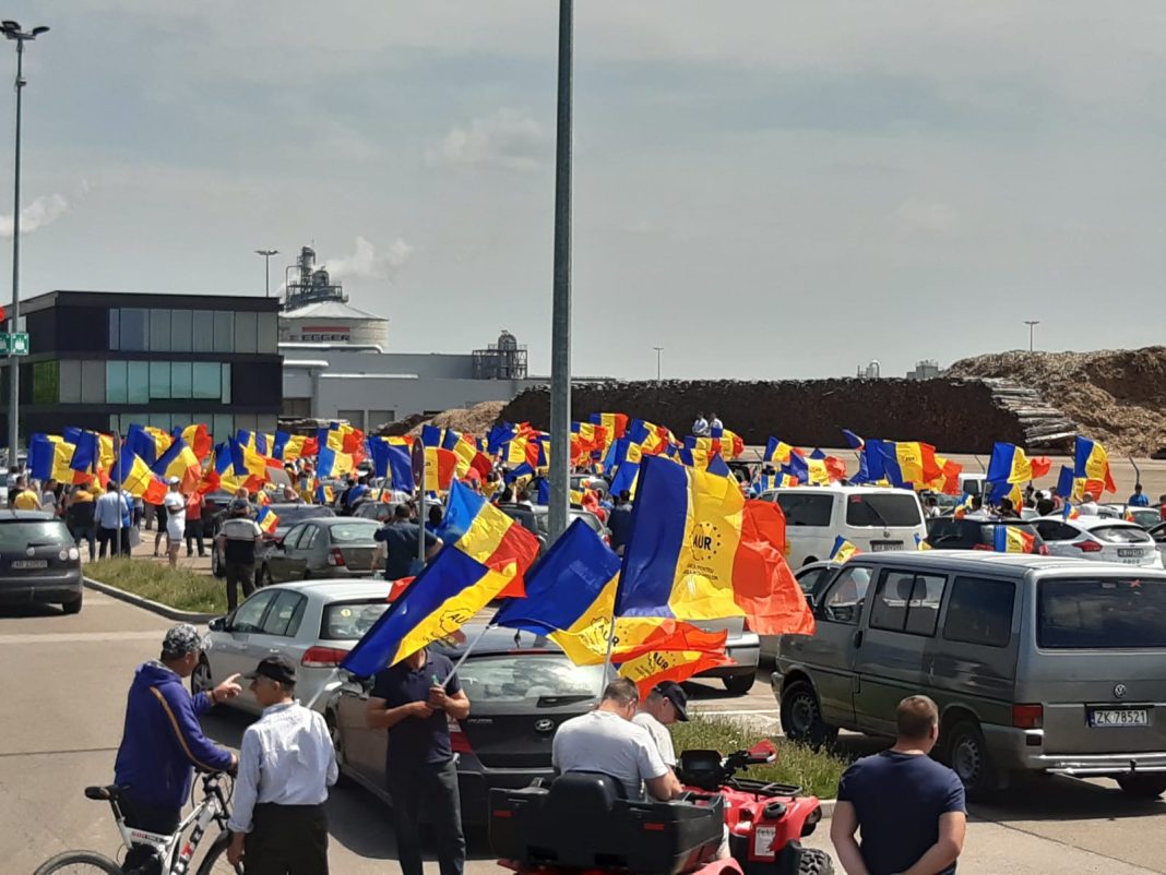 Românii devin tot mai sensibili la indolența guvernanților față de cei care ne taie pădurile și ne fură lemnul. Astăzi, orașul sucevean Rădăuți a fost luat cu asalt de mii de iubitori de natură, de pădure, de activiști ce refuză să accepte ticăloșia celor ce ne conduc. Un miting fără precedent, inițiat de George Simion și de partidul AUR a scos din case mii de români, veniți să protesteze în fața fabricilor Egger și Schweighofer. Oamenii au respectat distanțarea socială și au dat de mai multe ori ture în jurul fabricilor cu sutele de autoturisme în care veneau. S-a claxonat, s-a fluturat tricolorul și s-au strigat lozinci patriotice.