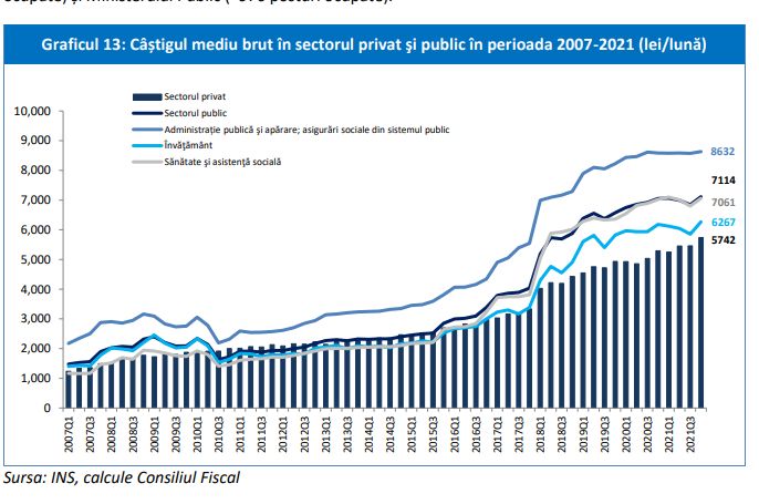 Salariul mediu brut în sistemul public a fost, în 2021, cu aproape 30% mai mare decât în mediul privat, potrivit datelor publicate de Consiliul Fiscal. Sursa citată arată că salariul unui bugetar a ajuns în anul 2021 la 7.004 lei/lună, depășindu-l cu 27,91% pe cel din mediul privat care s-a situat la 5.476 lei/lună.