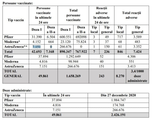 De la începutul campaniei de vaccinare, au fost vaccinate în România 1.658.269 persoane, din care 890.347 au primit o doză, iar 767.922 – ambele doze.