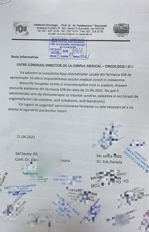 „Nu pot fi administrate serii de chimioterapie cu intenție curativă, paleativă și nici terapii de urgență (factori de creștere, acid zoledronic, acid ibandronic)”, atrag atenția medicii din spital, într-o notă internă obținută de sursa citată.