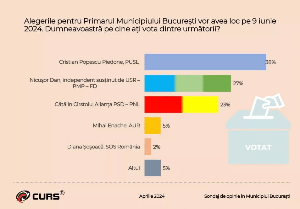 Conform sondajului CURS, citat de News.ro, 38% dintre cei chestionaţi ar vota pentru Cristian Popescu Piedone la Primăra Capitalei, 27%, pentru actualul primar Nicuşor Dan, 23%, pentru candidatul PSD-PNL, medicul Cătălin Cîrstoiu, 5% pentru candidatul AUR Mihai Enache şi 2% pentru Diana Şoşoacă.