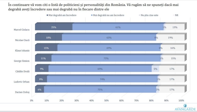 La capitolul încredere, clasamentul este deschis de liderul PSD Marcel Ciolacu, cu 25% cotă de încredere, ucrmat de premierul Nicolae Ciucă, cu 18%, iar podiumul este completat de preşedintele Klaus Iohannis (15%). Liderul AUR George Simion are o cotă de încredere de 11%, în timp ce preşedintele USR, Cătălin Drulă, adună 9%. Ludovic Orban (8%) şi Dacian Cioloş (6%) ocupă ultimele poziţii.