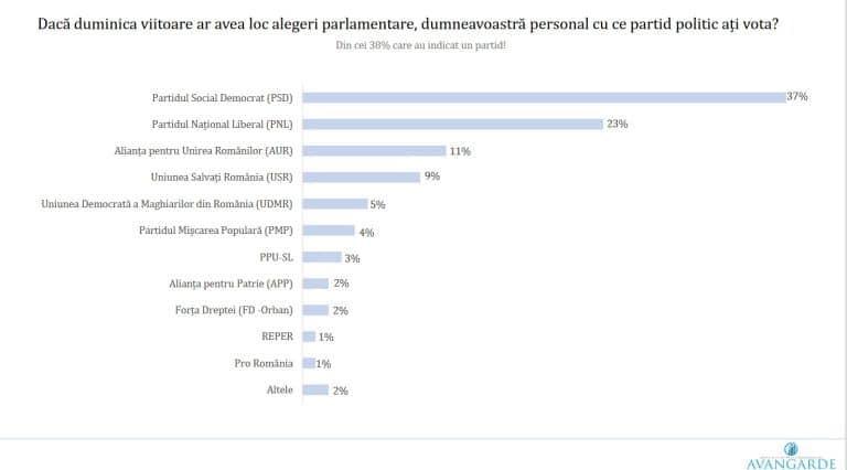 AUR se clasează pe locul trei, cu 11%, în timp ce USR ar obţine doar 9%. Singurul partid care ar mai trece pragul electoral ar fi UDMR – 5%. Formaţiunile conduse de Liviu Dragnea (APP) şi Ludovic Orban (Forţa Dreptei) sunt cotate la 2%.
