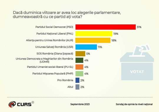 Potrivit unui sondaj CURS, PSD conduce în topul intenţiilor de vot la parlamentare, urmat de PNL, care e despărţit de AUR de doar un procent. Datele mai arată că partidul Dianei Şoşoacă ar obţine numărul de voturi necesar pentru a intra în Parlament, dacă mâine ar fi alegeri.