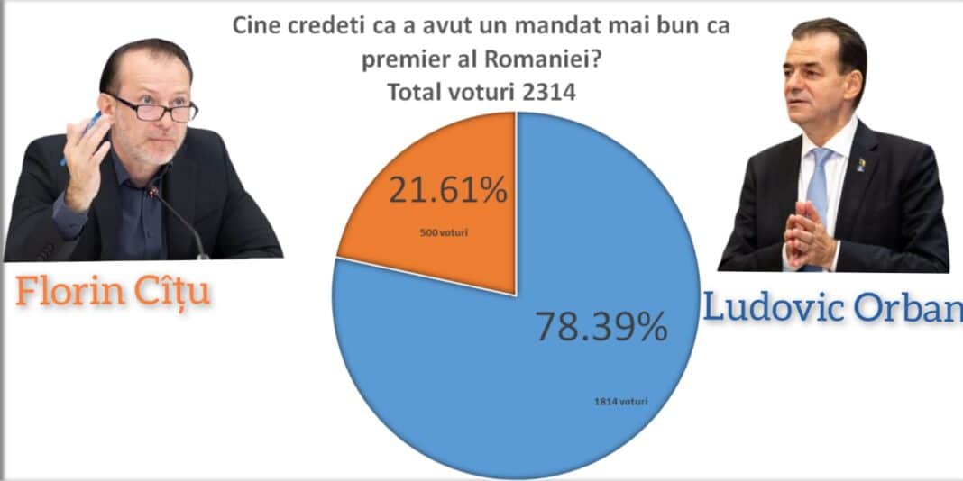 Rezultatul este devastator pentru Florin Cîțu, care a primit validare doar din partea a 21 la sută dintre cei care au votat. Peste 78 la sută îl văd pe Ludovic Orban ca fiind un premier mai bun.