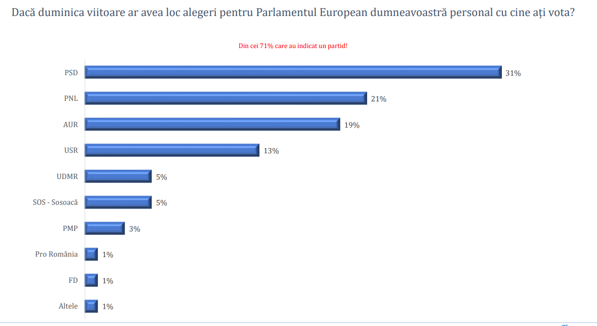 Un sondaj Avangarde făcut la comanda PSD arată că dacă săptămâna viitoare ar fi alegeri la europarlamentare, PSD ar fi votat de 31% dintre cei chestionați, în timp ce PNL are 21% de procente și este urmat la mică distanță de AUR, cu 19%. Surpriza vine, însă, de la partidul condus de Diana Șoșoacă, care ar înregistra un procent de 5%, ceea ce înseamnă că ar depăși pragul electoral și ar intra în Parlamentul European.