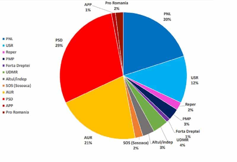 Aceeași cercetare mai arată următoarele rezultate: USR – 12%, UDMR – 4%, PMP – 3%, Pro România – 2%, REPER – 2%, SOS (Șoșoacă) – 2%, Forța Dreptei – 1%, APP – 1%, Altul 3%.
