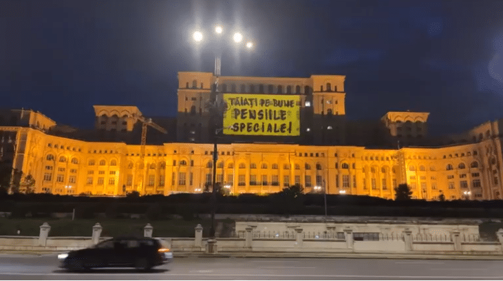 Mesajul a fost afișat din parcarea din Piața Constituției și reprezintă „un semnal de alarmă din partea cetățenilor, care cer o reformă reală pentru eliminarea cu adevărat a pensiilor de lux și a pensionării de la 45-50 de ani”.