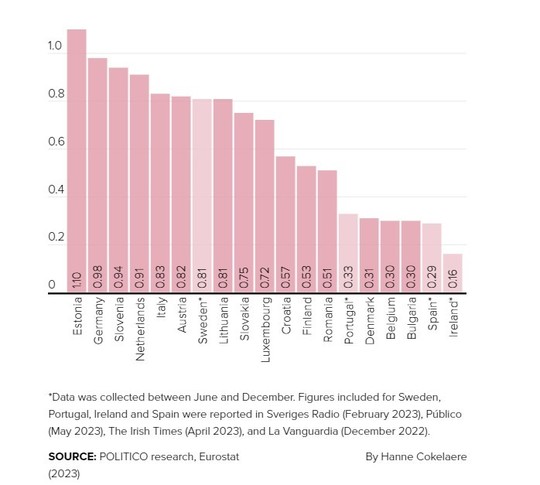 În fruntea clasamentului se află Estonia, care a aruncat la gunoi mai mult de o doză (1,10) pe cap de locuitor, urmată îndeaproape de Germania (0,98), care a aruncat şi cel mai mare volum brut de fiole. În acest clasament, România este sub media europeană, pe locul al 13-lea, cu 0,51 de doze de vaccin aruncate raportat la cap de locuitor, iar ultimul loc (din cele 19 posibile) este ocupat de Irlanda, cu 0,16 doze. Dacă această rată medie de risipă ar fi proiectată în restul UE, aceasta ar însemna peste 312 milioane de vaccinuri distruse, notează POLITICO.