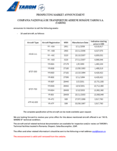Este vorba despre aeronavele fabricate în perioada 1993-2007, iar suma pentru care sunt scoase la vânzare este de 99 de milioane de dolari. Este puţin probabil ca TAROM să obţină suma cerută având în vedere că, din cauza pandemiei, mai multe companii se confrunta cu aceleaşi probleme ca urma a reducerii zborurilor .