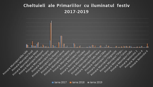 La polul opus sunt și primarii care nu au alocat fonduri destinate iluminatului festiv, respectiv: Primăria Municipiului Drobeta Turnu Severin (2018 și 2019); Primăria Municipiului Oradea (2018 și 2019).