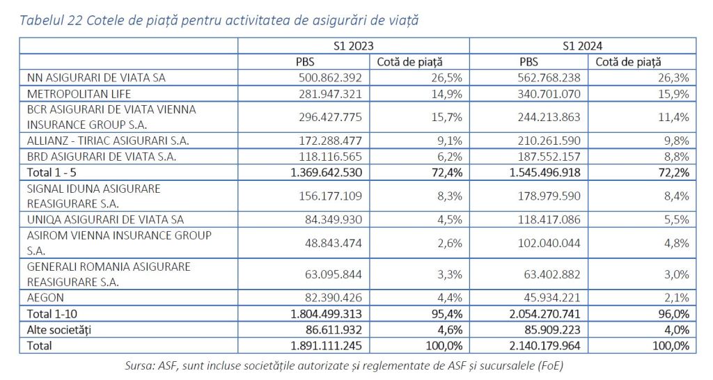 Primele 5 locuri în clasamentul asigurătorilor de viață sunt deținute de NN Asigurări de Viață (26,3%), Metropolitan Life (15,9%), BCR Asigurări de Viață (11,4%), Allianz-Țiriac Asigurări (9,8%) și BRD Asigurări de Viață (8,8%).