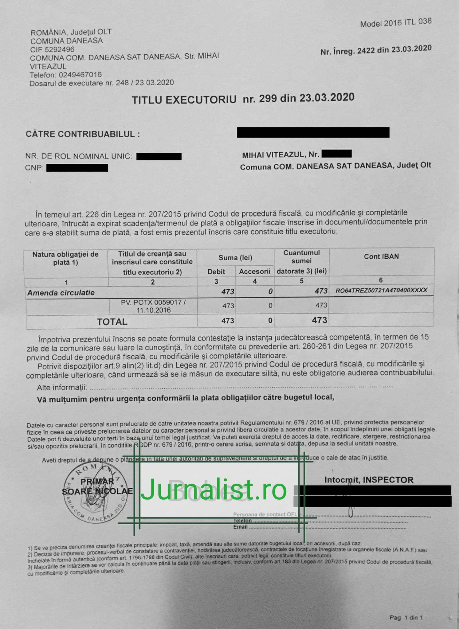 Primarul comunei Dăneasa, județul Olt vrea să intre în cartea recordurilor coronavirusului. În vreme ce ministerul Finanțelor dă ordonanțe de relaxare fiscală și ajutoare financiare populației, edilul Nicolae Soare trimite titluri executorii. În atașament aveți unul dintre aceste documente, emis pe 23 martie și trimis zilele trecute celui vizat.