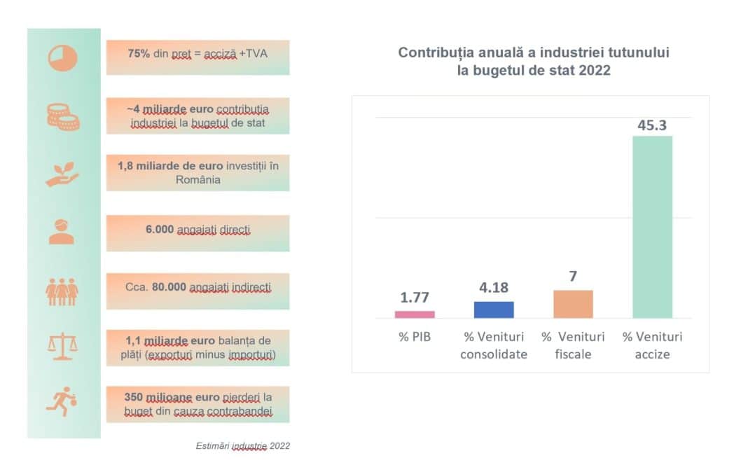 BAT, JTI, PMI și Imperial Tobacco reprezintă circa 95% din piață. Aceștia au investit până acum în România circa 1,8 miliarde de euro, iar anual, virează la buget aproximativ 4 miliarde de euro, însemnând accize, TVA și alte taxe și impozite.
