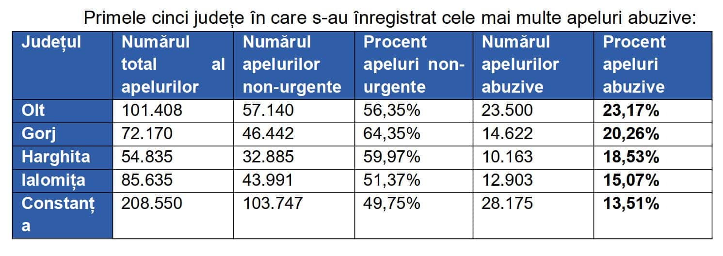 La nivel de țară, serviciul de urgență 112 a fost apelat abuziv de peste 231.000 de ori, în prima jumătate a acestui an, cele mai multe astfel de apeluri înregistrându-se în Olt, Gorj, Harghita, Ialomița și Constanța.