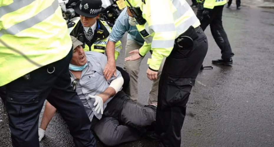 Protestatarul a fost încătușat și reținut de poliție.